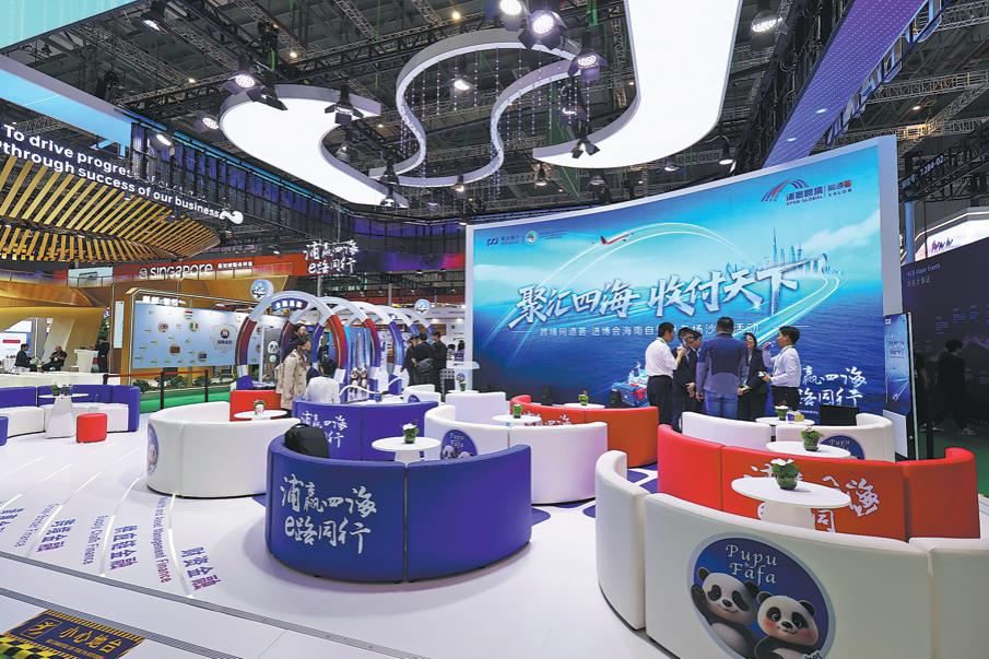 Посетители проверяват щанда на Shanghai Pudong Development Bank на осмото China International Import Expo в Шанхай на 7 ноември. CHINA DAILY