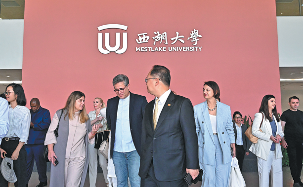 Дипломати посещават университета Westlake в Ханджоу, провинция Zhejiang, през октомври. Министерството на външните работи на Китай организира събитието и покани представители от 19 държави и международни организации да посетят новия изследователски ориентиран университет. ZHAO WENYU/CHINA NEWS SERVICE
