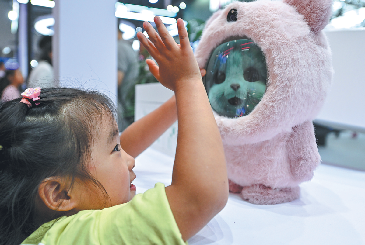 Дете взаимодейства с робот, предназначен за електронен спътник по време на World Smart Industry Expo 2025 в Чунцин на 6 септември. HE PENGLEI/CHINA NEWS SERVICE