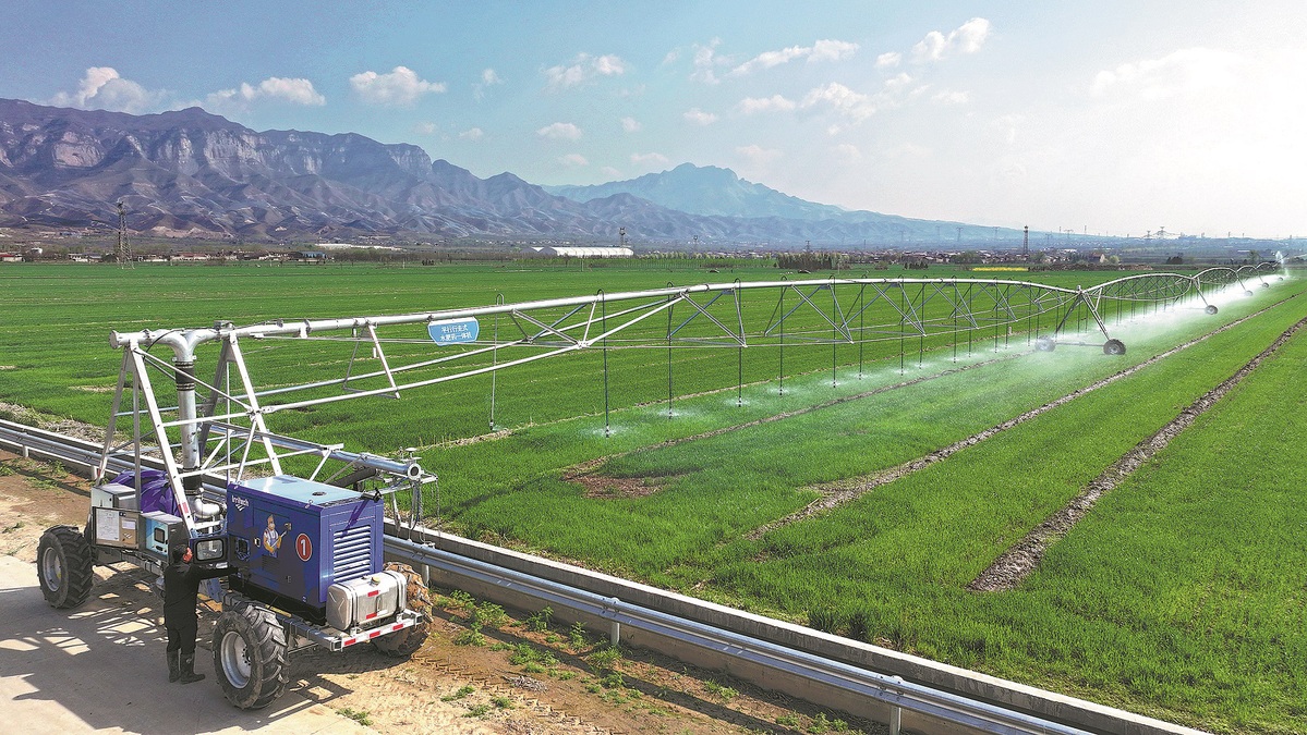 Работник управлява интелигентна система за напояване и торене в пшенично поле в интелигентна селскостопанска зона в окръг Джишан на Юнченг, провинция Шанси, във вторник. Окръгът насърчава водно-ефективно земеделие чрез приемане на интелигентни технологии за напояване и безпилотно оборудване за пръскане, което помага за намаляване на разходите, като същевременно подобрява ефективността. LI LUJIAN/ЗА КИТАЙ ДАЙЛИ