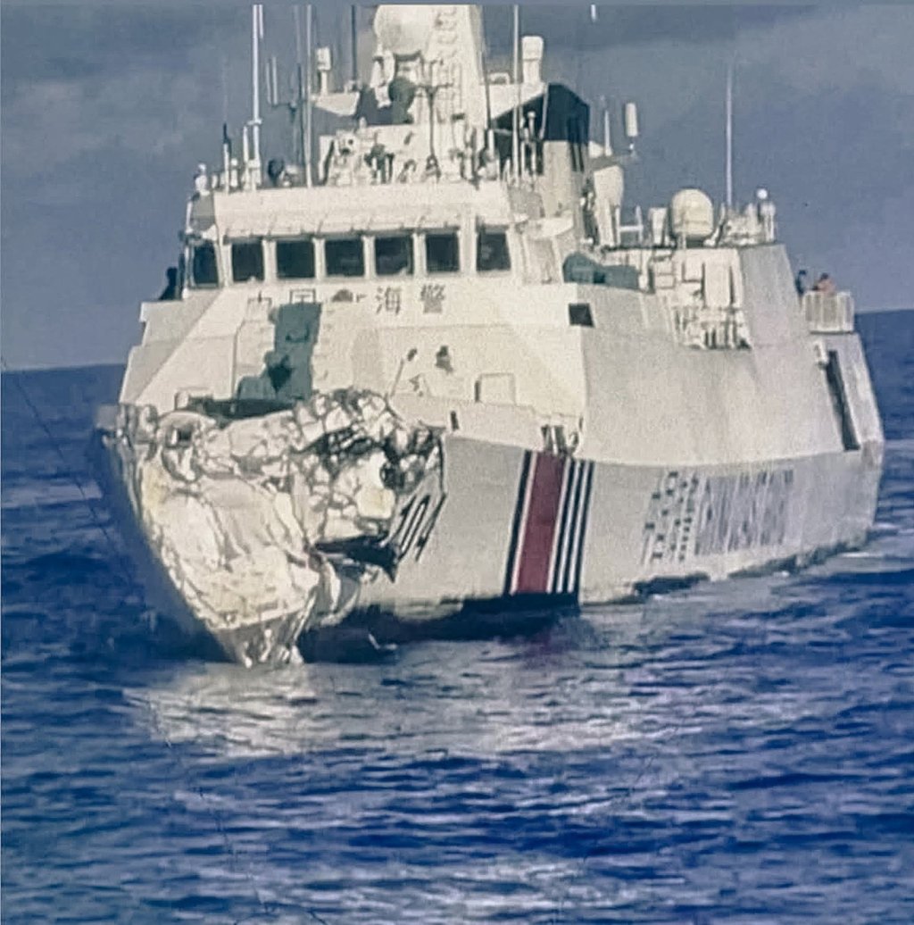 Кораб на китайската брегова охрана се сблъска с кораб на ВМС на НОАК с номер 164, на около 10 морски мили източно от плитчината Скарбъро, което доведе до значителни щети на кораба на бреговата охрана. Снимка: Филипинската брегова охрана