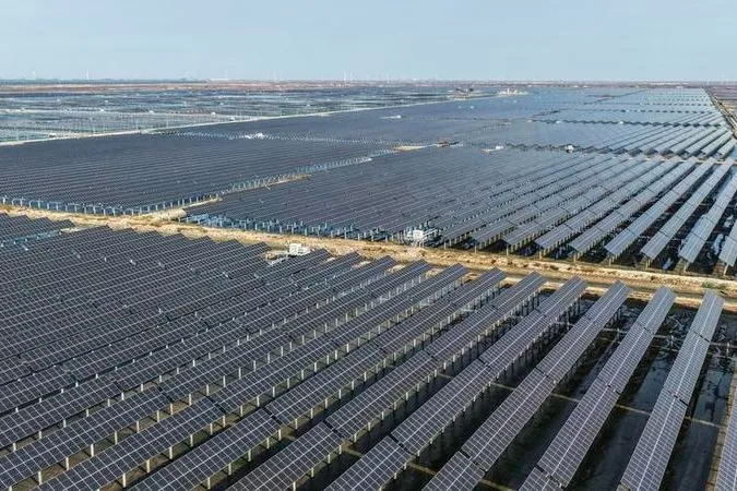 Въздушна снимка с дрон, направена на 16 ноември 2025 г., показва проект за производство на 240-мегаватова фотоволтаична електроенергия в град Донгинг, провинция Шандонг в Източен Китай. [Photo/Xinhua]