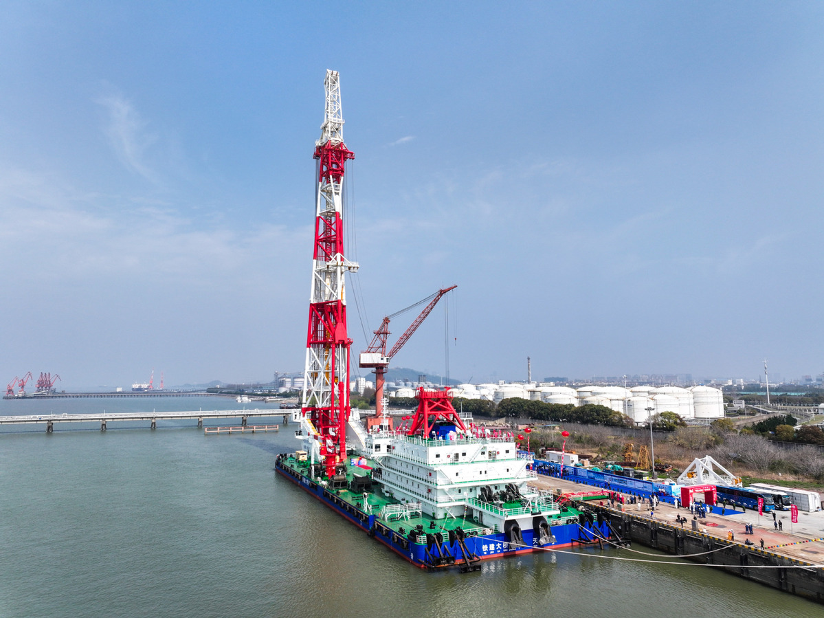 Кораб за набиване на пилоти с динамично позициониране, с височина на пилотната рамка от 156 метра, беше доставен в Нантонг, провинция Дзянсу в Източен Китай. [Photo/Xinhua]