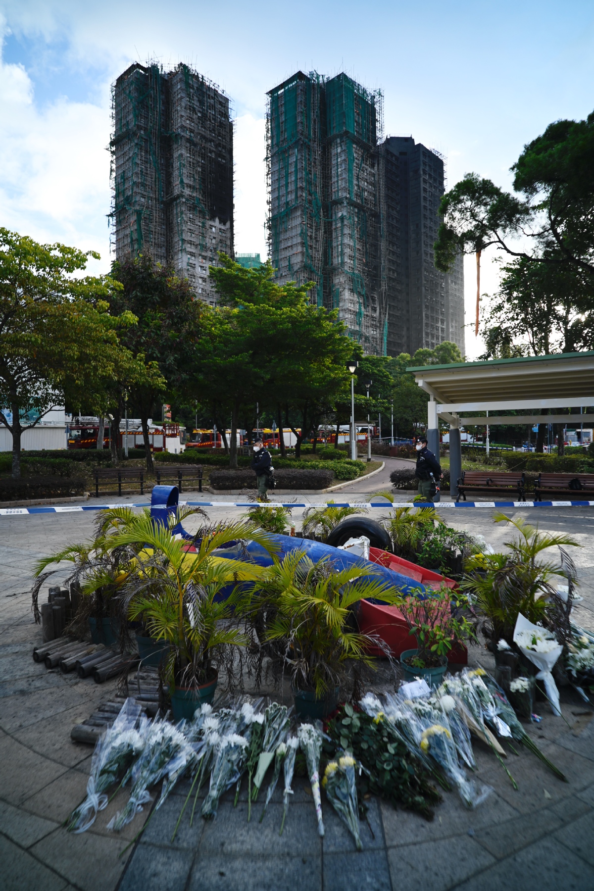 Тази снимка, направена на 29 ноември 2025 г., показва цветя, поставени близо до мястото на пожара в жилищната сграда, за да скърбят за жертвите в Тай По в Хонконг. [Photo/Xinhua]