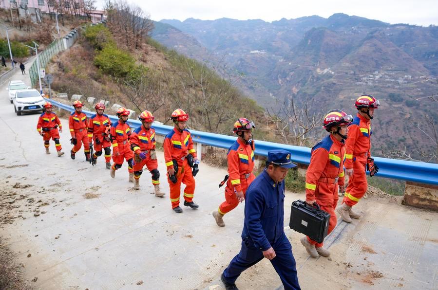 Спасителните работници се виждат да патрулират в село Хонгшиян след земетресение в окръг Qiaojia, провинция Юнан в Югозападен Китай, 20 януари 2026 г. [Photo/Xinhua]