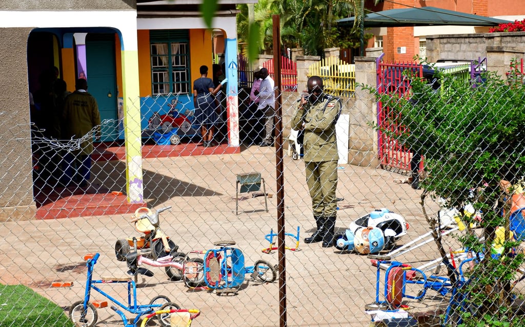 Полицейски служител охранява местопроизшествието в училището в Кампала, Уганда след намушкването с нож на 2 април. Снимка: Reuters