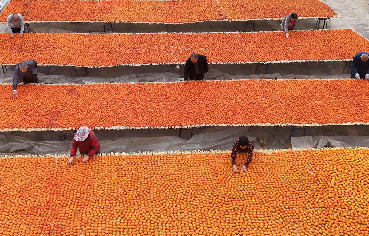 Фермери в село Xuecungou, град Hanxue на окръг Wanrong в Yuncheng, провинция Shanxi, сортират и сушат райска ябълка след скорошната изобилна реколта. [Photo by Zhang Huaixin/For chinadaily.com.cn]