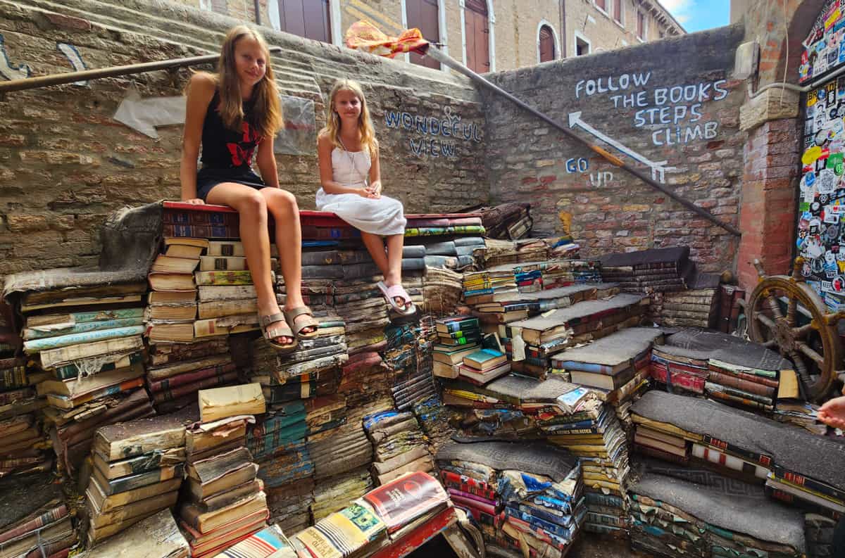 kalyra and savannah sitting on staircase of booksThe secret Libreria Acqua Alta bookshop