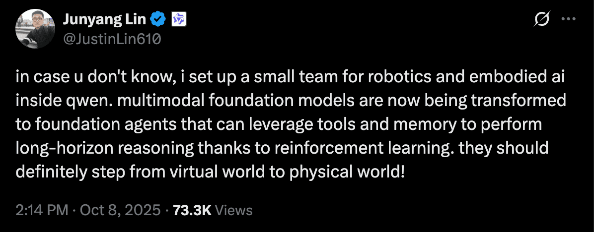 Лин също така отбеляза на X, че „мултимодалните модели на основата сега се трансформират във фундаментални агенти, способни да разсъждават с дълъг хоризонт чрез обучение с подсилване, използвайки инструменти и памет.“ Той добави, че подобни приложения „естествено трябва да се преместят от виртуалния свят във физическия“.