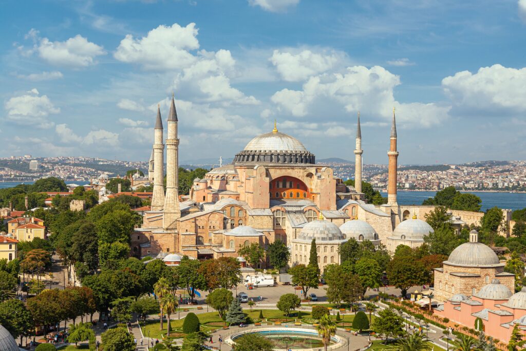 View from the Bosphorus Strait, with the Hagia Sophia and Blue Mosque visible.