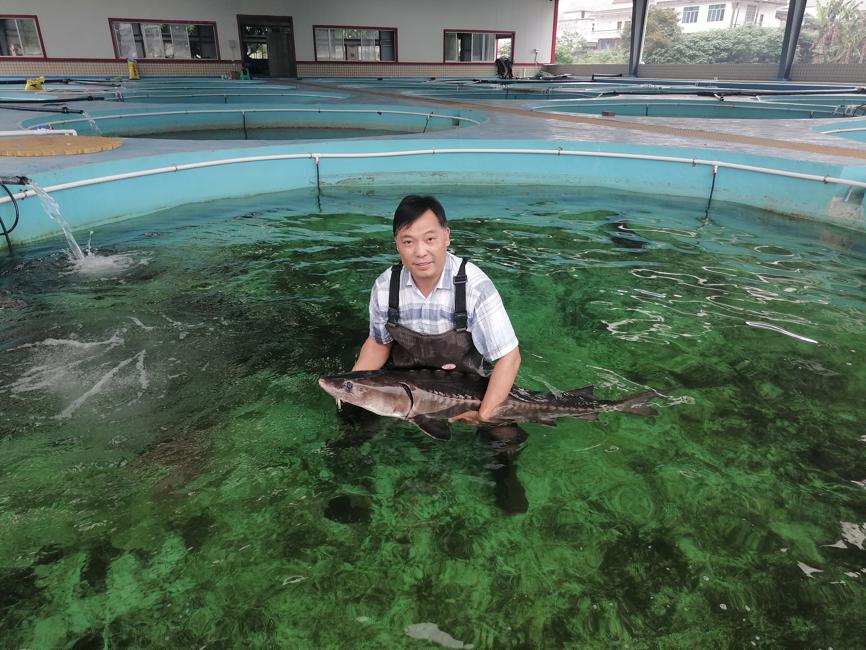 Zhou Liang, ръководител на Института за редки водни животни Yibin, инспектира отглеждана в плен есетра Yangtze. [Photo provided to chinadaily.com.cn]